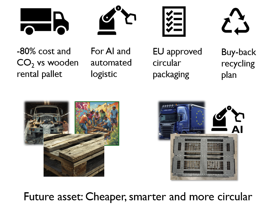 Reusable plastic pallets with top circular economy performance: Unbreakable under normal loading, temp range 40°C to -20 °C with 50 years designed lifetime